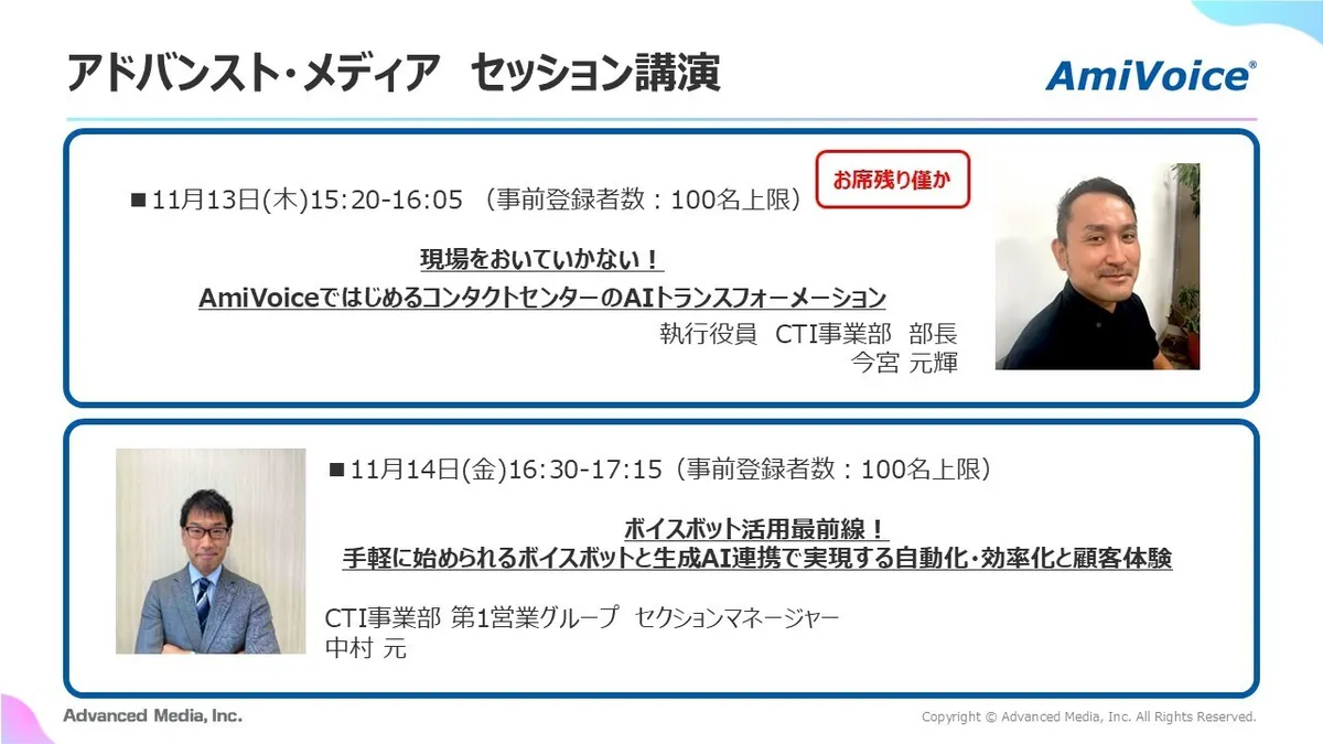 本講演では、自動応対において鍵となる音声認識精度や、スモールスタートで効果を出すためのノウハウを解説。当社のボイスボット「AmiVoice ISR Studio」を活用した導入事例や、生成AIとの連携による高度な対話もデモを交えご紹介します。