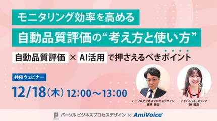 日頃より当コミュニティをご利用いただきありがとうございます。このたび、弊社が主催するウェビナーにて、自動品質評価やAI活用によるモニタリング業務の効率化をテーマに、最新技術のトレンドや運用上の課題、リスク・懸念点について分かりやすく解説します。品質管理の標準化や業務効率化を目指す方に最適なウェビナー